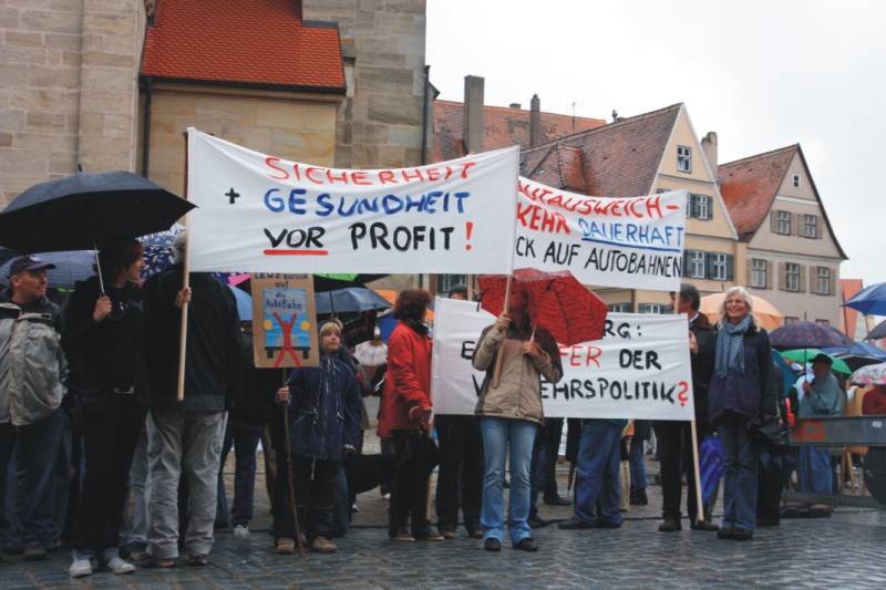Am 14. September demonstrierten trotz strömendem Regen mehrere hundert Personen vor dem Münster St. Georg gegen den Mautausweichverkehr, für die Fortsetzung der B25-Sperrung für diesen Verkehr und für eine Ausdehnung der Sperrung von Donauwörth bis Feuchtwangen. Nach Ansicht der Redner, darunter Mitstreiter aus Harburg, Möttingen, Feuchtwangen und Dinkelsbühl lässt sich nur so schnell und für alle Anlieger Entlastung vom Schwerlastverkehr erreichen.