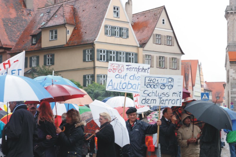 Bewusst wurde die erste Demo in Dinkelsbühl abgehalten um darauf aufmerksam zu machen, dass Sperrungen funktionieren, wenn man nur will. Mit bislang rund 4000 Ausnahmegenehmigungen wird es den überregionalen Spediteuren momentan aber noch zu leicht gemacht, so Wolfgang Hauf aus Feuchtwangen. Hier wäre ein erster Ansatzpunkt, der in Zukunft für noch mehr Ruhe sorgen könnte.