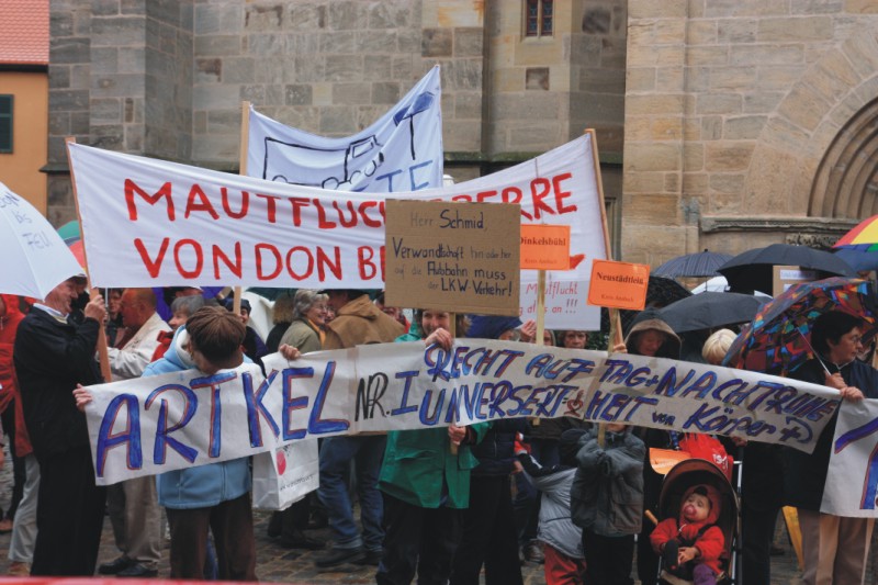 Am 14. September demonstrierten trotz strömendem Regen mehrere hundert Personen vor dem Münster St. Georg gegen den Mautausweichverkehr, für die Fortsetzung der B25-Sperrung für diesen Verkehr und für eine Ausdehnung der Sperrung von Donauwörth bis Feuchtwangen. Nach Ansicht der Redner, darunter Mitstreiter aus Harburg, Möttingen, Feuchtwangen und Dinkelsbühl lässt sich nur so schnell und für alle Anlieger Entlastung vom Schwerlastverkehr erreichen.
