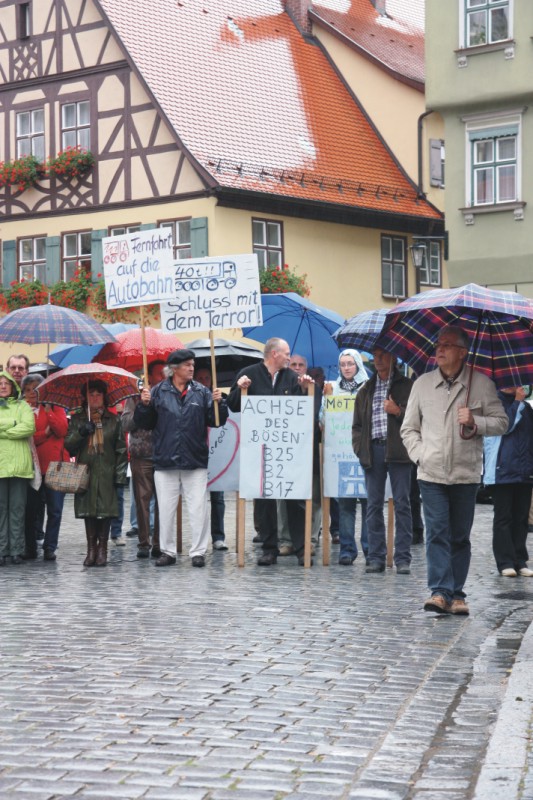 Am 14. September demonstrierten trotz strömendem Regen mehrere hundert Personen vor dem Münster St. Georg gegen den Mautausweichverkehr, für die Fortsetzung der B25-Sperrung für diesen Verkehr und für eine Ausdehnung der Sperrung von Donauwörth bis Feuchtwangen. Nach Ansicht der Redner, darunter Mitstreiter aus Harburg, Möttingen, Feuchtwangen und Dinkelsbühl lässt sich nur so schnell und für alle Anlieger Entlastung vom Schwerlastverkehr erreichen.